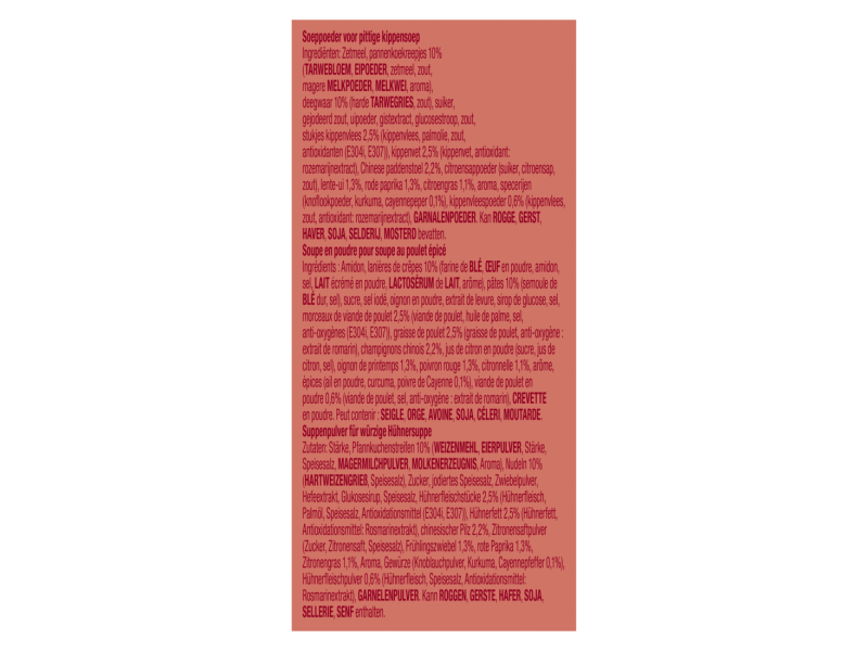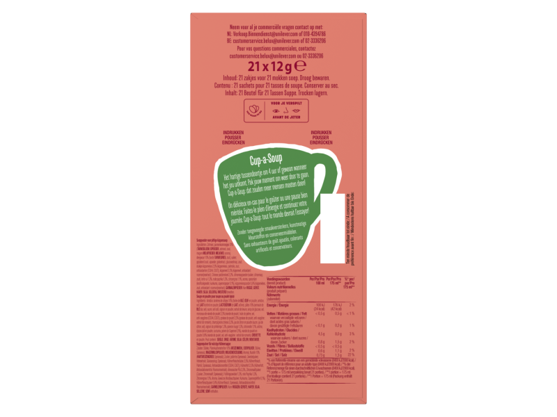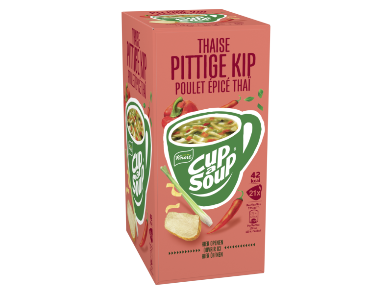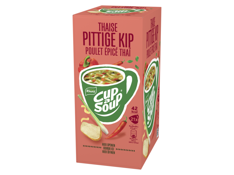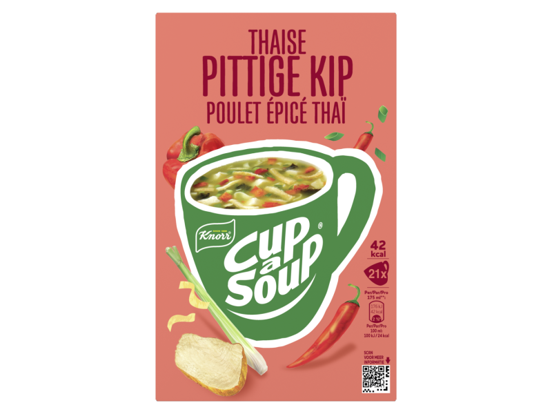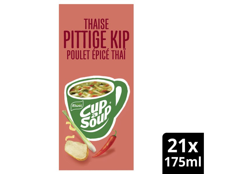 Cup-a-Soup Thaise pittige kip, kippensoep met een Thaise twist! Met de door onze boeren verbouwde beste ingredienten van het land. We drogen deze ingrediënten zorgvuldig en voegen de juiste hoeveelheid kruiden toe voor de lekkerste smaak. In deze Cup-a-Soup variant zitten geen smaakversterkers, kunstmatige kleurstoffen en conserveermiddelen. Het is daarnaast voorzien van het ‘Ik-kies-bewust-logo’.